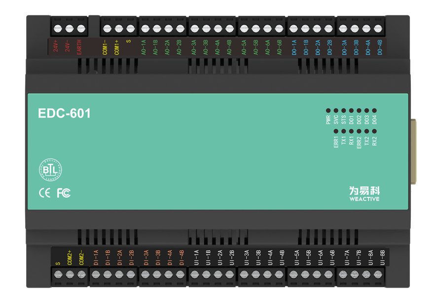 EDC-601可编程模块是公司最新研发的控制器,支持国际标准的BTL、CE、FCC认证,同时具备BACnet MSTP和Modbus RTU两大开放性通讯协议,广泛应用于各种控制系统,可以满足对多种设备进行监控。